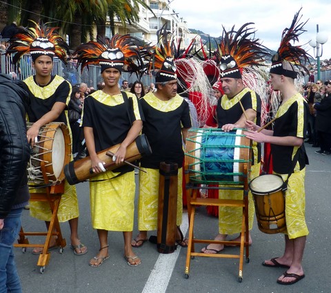 Des musiciens polynésiens ( pas tous vrais ) transis de froid les pauvres .