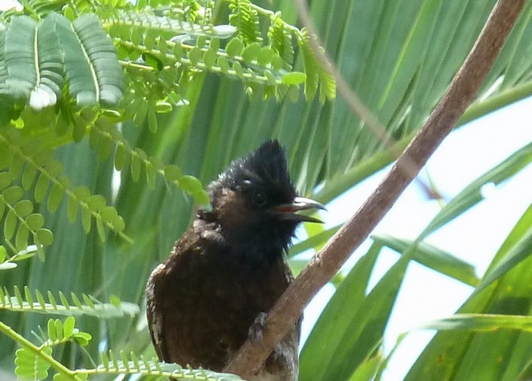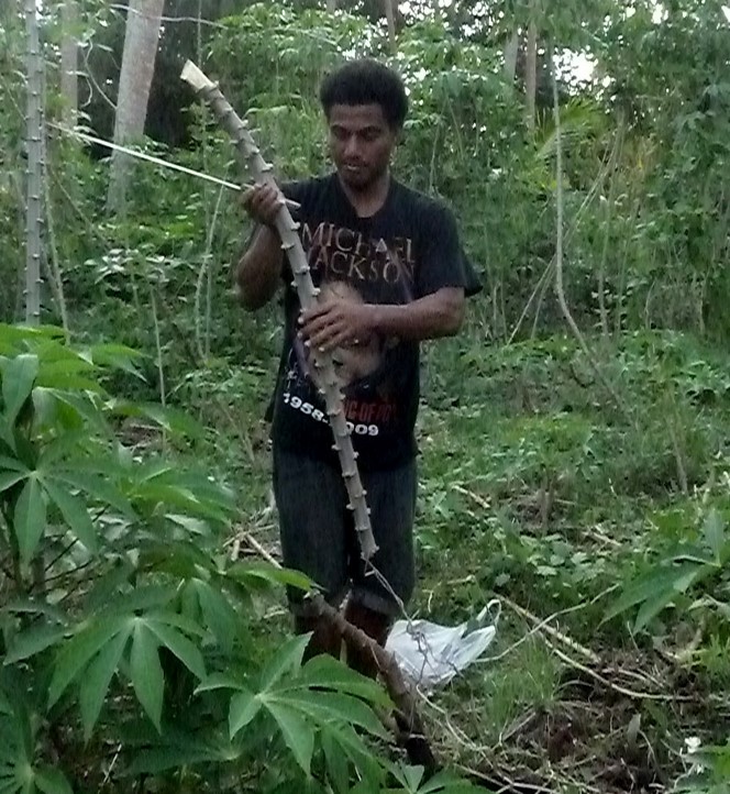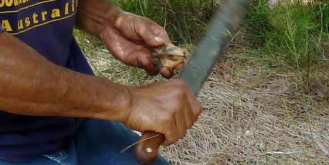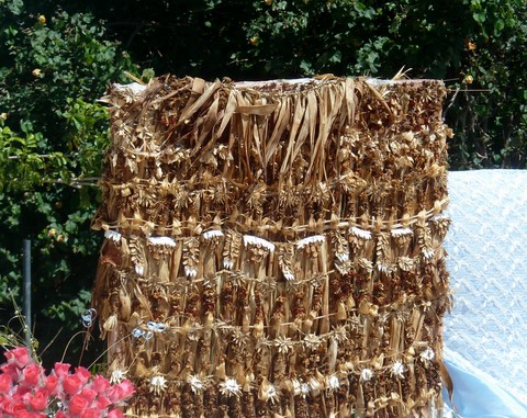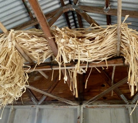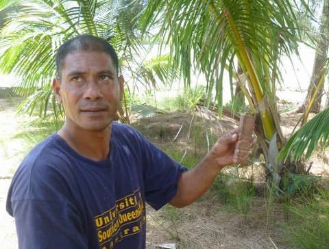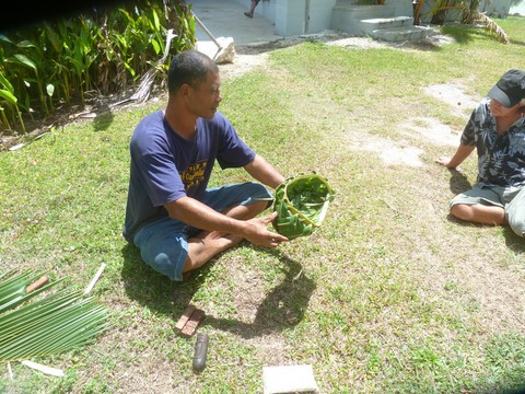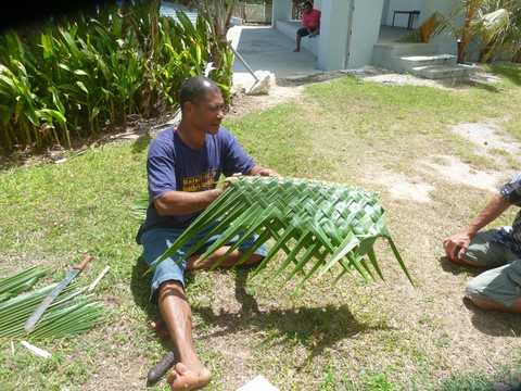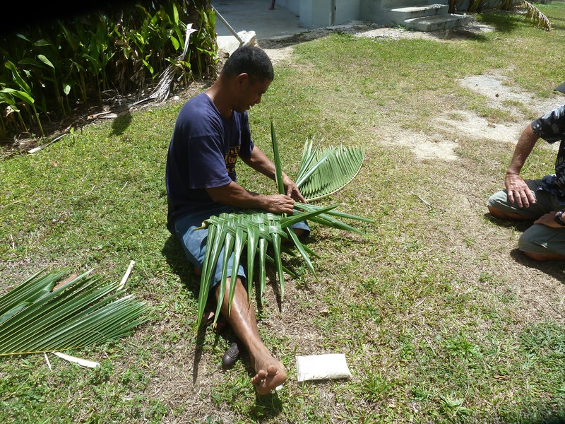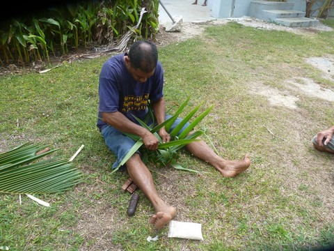 Les démonstrations continuent : il fait le tressage des palmes pour le toit .