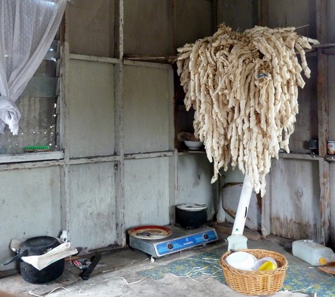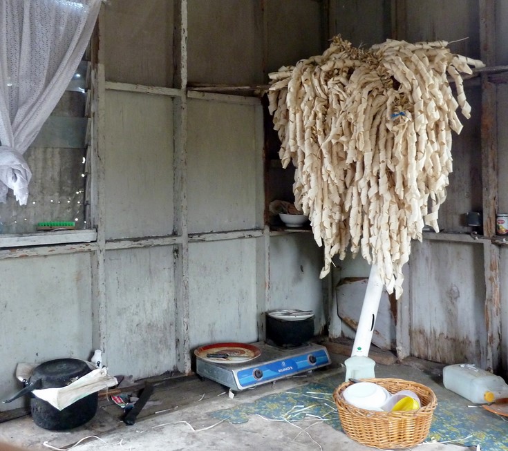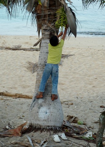 Il faut faire une tresse c'est simple , mais cela se complique car les fibres de coco sont très petites donc il faut les rabouter ( les rallonger ) à chaque fois que l'on tresse . Oh quel travail pour faire une ceinture . Je comprend que l'on ne voit pas beaucoup de femmes dehors . Elles sont toutes occupées à faire le tressage , la cuisine et si en plus elles s'occupent des enfants qu'elles ont en grand nombres .