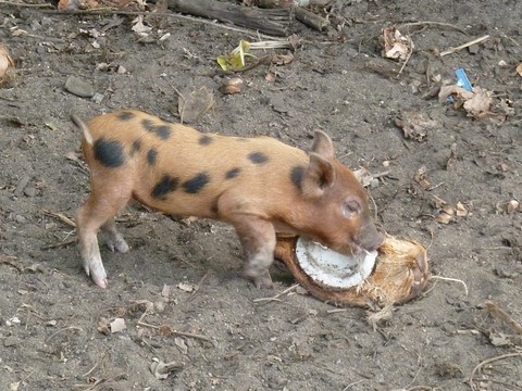 A ceux qui les nourrissent tout simplement . Tous les soirs les hommes coupent des cocos en 2 et les donnent aux cochons qui se jettent dessus voracement .