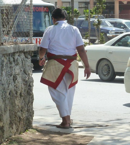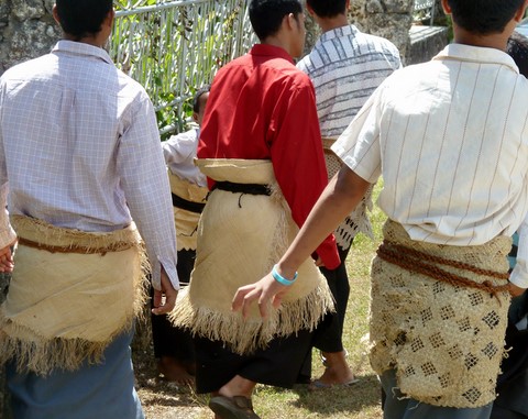 Un groupe de marins serait arrivé en bateau à Tu'i Tonga, leurs vêtements déchirés par la tempête. Ils taillèrent alors la voile de leur bateau, faite du même tissu que leur vêtements , pour s'en draper. L'empereur, ému de leur sacrifice pour lui apparaître présentables, décréta que cela constituerait désormais le vêtement de cérémonie.