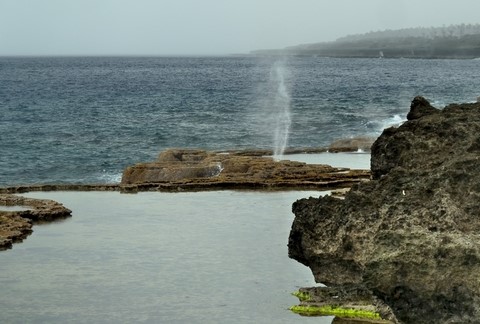 Au Nord-Ouest de l'île il y a toute une partie de la coté avec des souffleurs alignés ou presque . Malheureusement il n'y a pas beaucoup de houle aujourd'hui ( ouf pour Pen Kalet ) . Sans houle , le spectacle n'est pas très impressionnant .