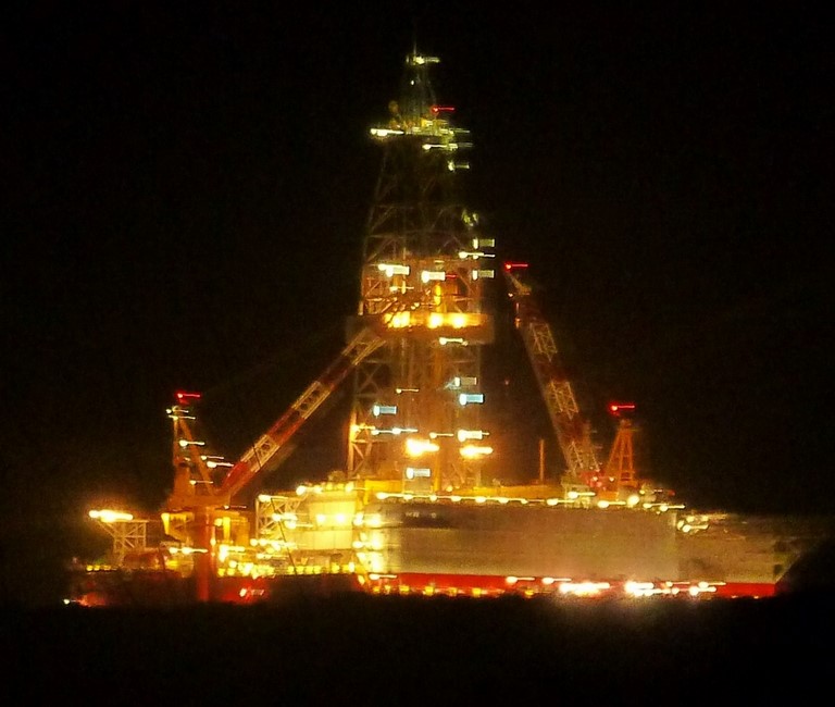 Au dessus de la colline , aperçu sur la plateforme pétrolière éclairée comme un arbre de Noël