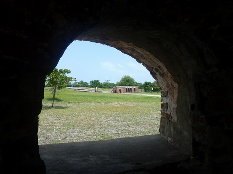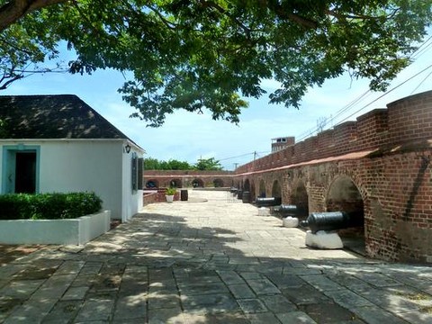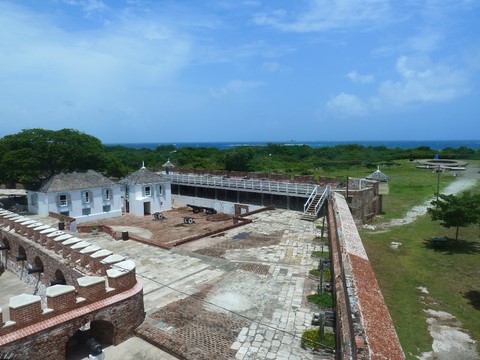 En Jamaique il y a eu de nombreux tremblements de terre très dévastateurs . Ce fort construit par les anglais pour protéger Kingston sur la presqu'île de Port Royal a assez bien résisté mais une grand partie du site est tombée dans la mer , en tuant la moitié des habitants de Port Royal en 1692 .