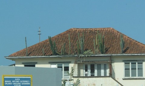 Contraste amusant : des maisons très strictes et 100 mètres plus loin des cactus dans la gouttière !
