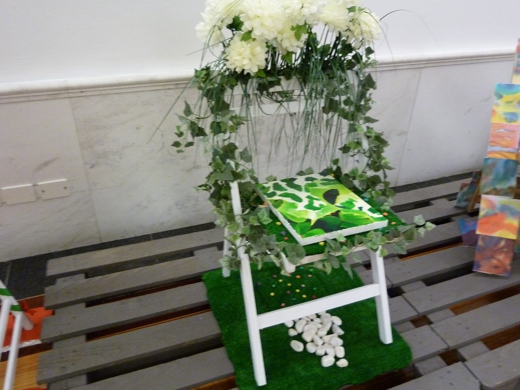Hier au magasin Vodafone il y avait beaucoup de monde . Mais vous mettez 2 bavardes ensemble et les minutes passent très vite et très agréablement . Donc j'ai rencontré une designer espagnole . Elle a participé à un concours de décoration de chaises . Sur son conseil je suis allée donc voir l'exposition de ces chaises décorées .