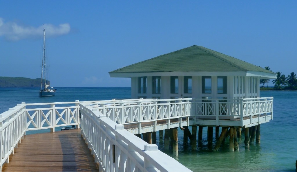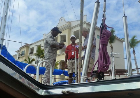 Nous n'avons aucune instruction nautique sur le port de Punta Cana . Heureusement nous arrivons de jour ! Nous voyons un chenal , nous le prenons et entrons dans un vaste complexe hôtelier . Des gens sur une annexe nous disent "Todo derecho = tout droit " .C'est bon nous sommes arrivés au bon endroit ouf . On vient nous dire de nous installer à la station essence . Nous y allons et la commence un grand ballet d'officiels très gentils et souriants , les uns nous demandant de l'argent les autres nos papiers et ceux du bateau . Et tout en faisant ces formalités folkloriques , nous avons pris de l'essence . Il a fallu donc donner 20 dollars pour l'agriculture , 50 dollars pour le bateau et 10 dollars par personne et nous avons appris qu'à la sortie nous payerons une taxe de 20 dollars pour la marine de guerre !
