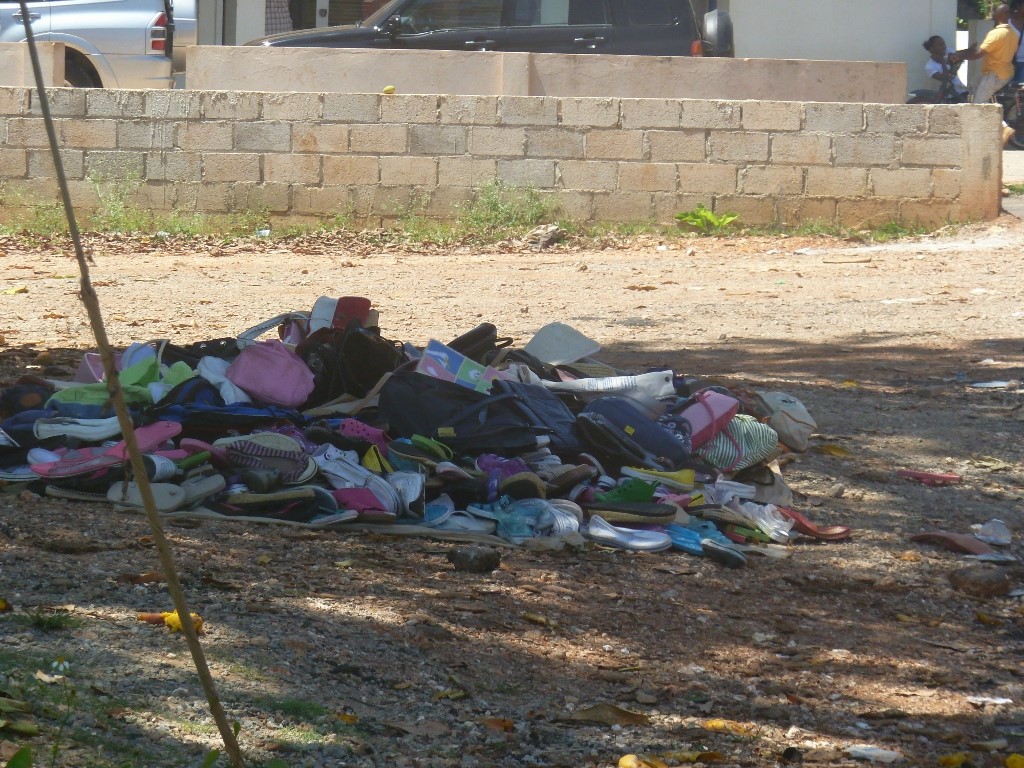 des femmes assises sous un arbre qui vendent des loques installées en 3 tas sur des plastiques