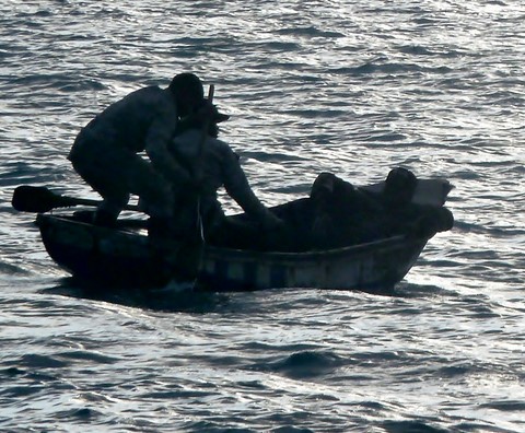 Une petite pirogue en bois avec 3 hommes en battle dress