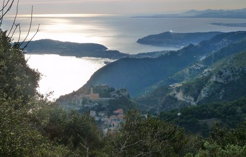 Visite de la maison de la nature ou travaille Florent près du village de Eze .Aperçu du village d'ailleurs dans le parc .Très belle vue !