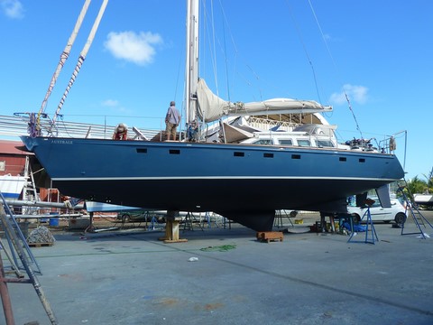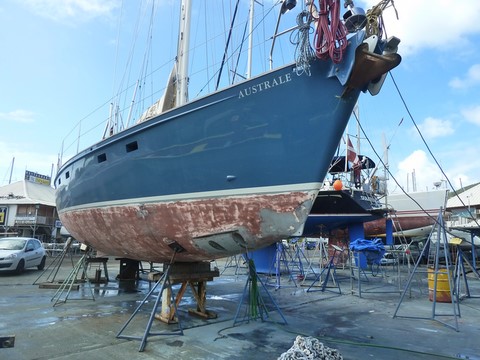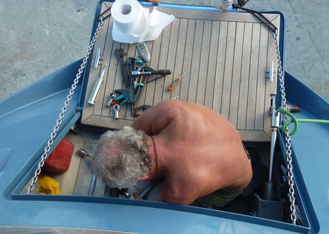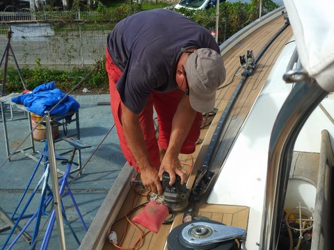 Petite remise en état d'Australe . Ca ponce partout , le teck , la coque et la lutte contre les diverses poussières est perdue d'avance . A mon grand désespoir ! Marc lui installe, change et transforme comme d'habitude .