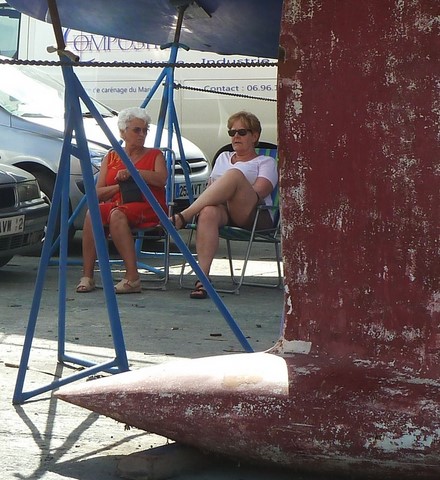 A l'ombre d'une coque de bateau , elle est pas belle la vie ! et pendant ce temps ,à 6 mètres d'elles , le mari - marin ponce dans un nuage de poussière bleuâtre , le safran !
