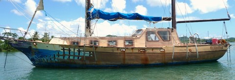 C'est un bateau en ferro-ciment déguisé en bateau en bois . Quel travail ! Chapeau l'artiste .