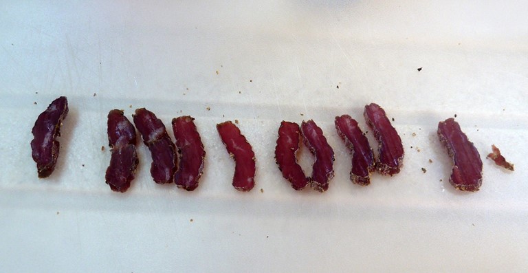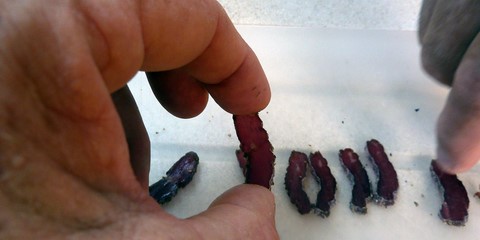 Après un traitement assez spécial puis un séchage dans le vent pendant plusieurs jours nous avons obtenu un résultat excellent assez similaire à la " viande des grisons " . Cela se déguste très rapidement .