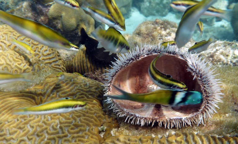Ce fut la ruée des petits poissons , girelles , colas , demoiselles , qui en 10 minutes ont nettoyé complètement l'oursin . Ce fut impressionnant à voir .