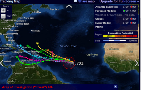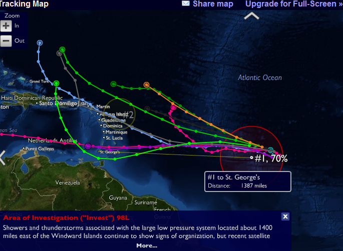 Normalement les ABC (Bonaire en fait partie ) ainsi que les Aves et les Roques sont considérées comme des zones à l'abri des cyclones ! Sur la carte publiée aujourd'hui dans un site de prévision métrologique (Stormplus ) , 3 courbes font passer une onde tropicale ( mais elle a 70% de chances de se transformer en cyclone ) pas loin de nous .Elle vient d'avoir un numéro = 98 . Elle n'a pas encore de nom ....