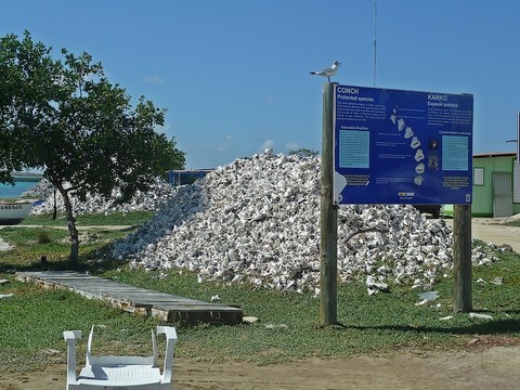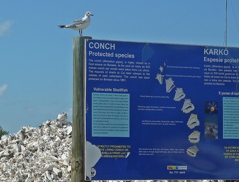 Devant 3 énormes tas de lambis , une pancarte sur la protection du lambis !