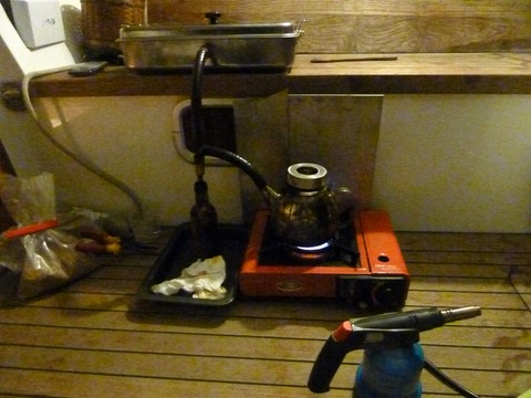 L'appareil est un peu préhistorique . Mais le résultat est excellent après 3 heures de surveillance et de réglages incessants ( à la nuit tombante ! ) car il ne faut surtout pas que la fumée soit trop chaude et cuise les filets .
