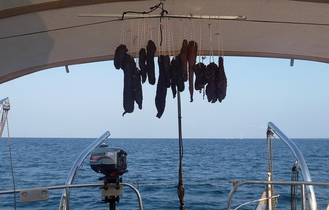 Nous naviguons contre le vent , au moteur . La mer est assez formée ... mais nous avons bien fermés les hublots cette fois ! Quelques miles avant l'arrivée , une assez grosse dorade corryphène a mordu voracement l'hameçon . Chic c'est un délicieux poisson ! Cette fois nous allons sortir le fumoir dès l'arrivée .