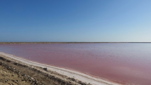 il y a des lacs roses ou prolifèrent des algues caroténoïdes qui colorent l'eau et les flamants roses également .