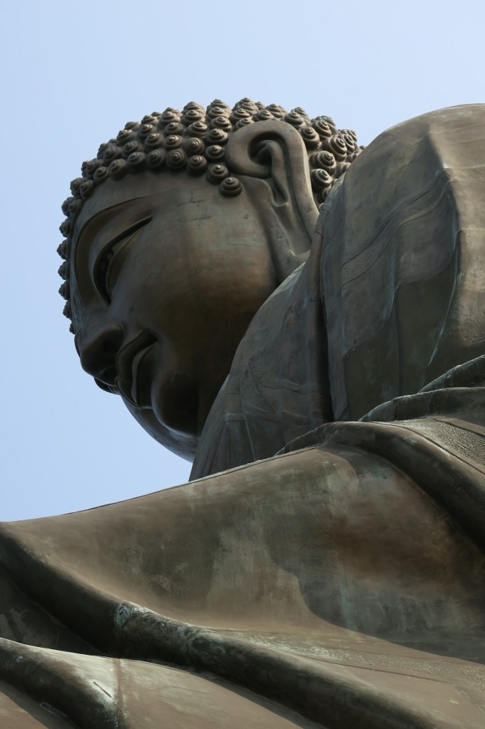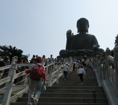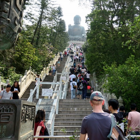" Du monastère, il faut gravir un escalier d’environ 260 marches pour atteindre le sommet de la colline, où se trouve la statue du Bouddha assis, posée sur un socle, et orientée face au nord-ouest, en direction de Pékin. Avec ses 34 mètres de haut, c’est l’une des plus grandes du monde en son genre.