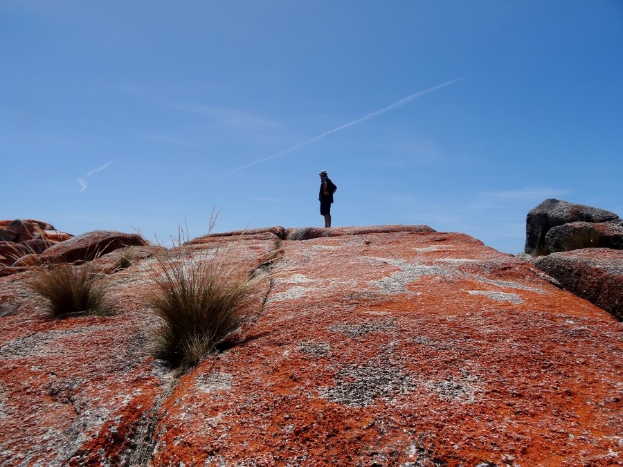 Nous avons fait 13 kms de marche le long du bord de mer aux rochers recouverts d'un lichen rouge éclatant .