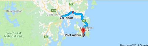 Départ pour Port Arthur au sud est de Hobart un ancien centre pénitentiaire situé sur la presqu'île Tasman .
