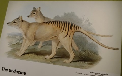 Le loup ou le tigre de Tasmanie , race éteinte en 1936 à cause de l'homme .