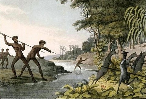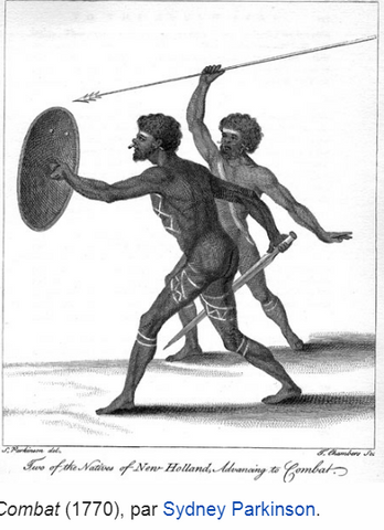 Deux Aborigènes s'approchent du bateau, ignorant les cadeaux que Cook leur propose. On tire un coup de mousquet au-dessus de leur tête, blessant légèrement le plus vieux qui se met à courir vers les cases .