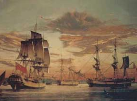 " Le 13 mai 1787, un premier convoi de onze navires appareillent de Portsmouth, en Angleterre, sous le commandement du capitaine Arthur Phillip."