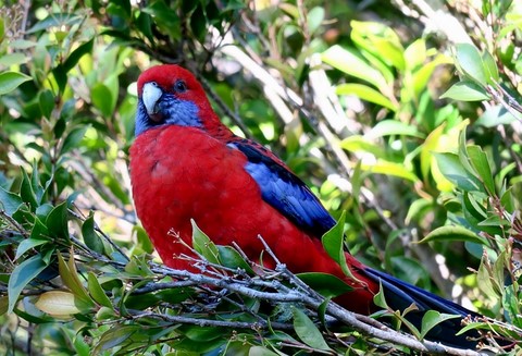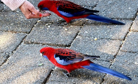 Des " Rosella cramoisie " se gavent de graines données par les touristes .