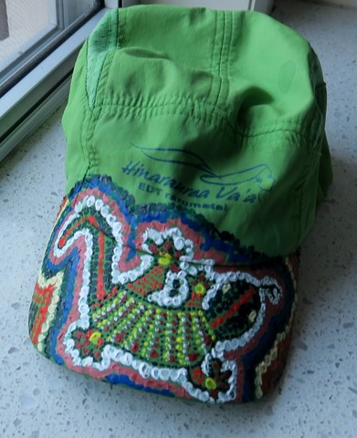 Pour m'amuser , j'ai décoré ma casquette polynésienne des courses de pirogues .