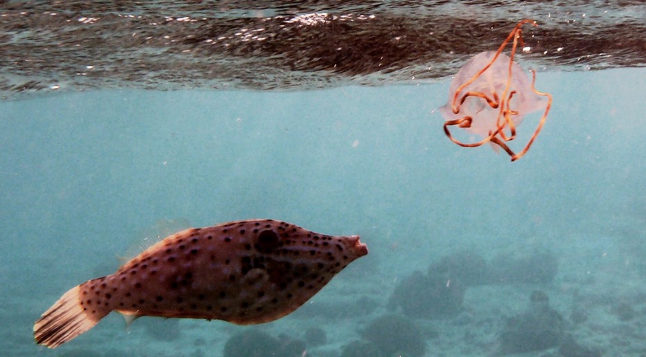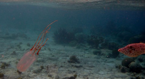 Merci à la bourse car cette méduse est dangereuse pour l'homme car ses tentacules sont très urticantes . De plus je me suis rendue compte que cette méduse a des yeux , il parait même qu'elle en a 24 . Elle se sauve quand la bourse l'approche et elle recroqueville ses tentacules pour que la bourse ne les attrape pas . mes photos sont très mauvaises car en plus le soleil timide de l'après-midi part se coucher !!