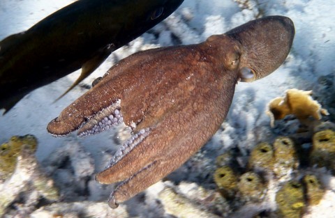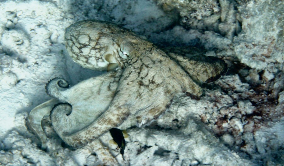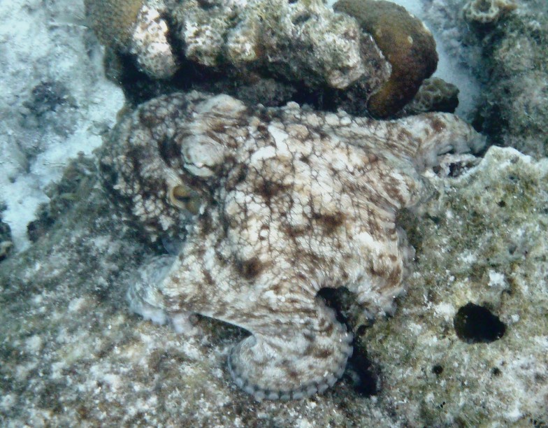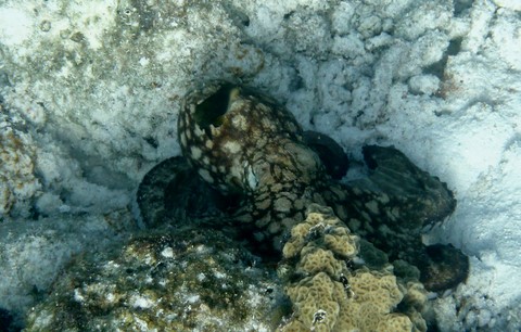Je crois qu'elle était assez mal en point , poursuivie par des poissons envahissants , moches et gâcheurs de photo en plus . je les ai chassés par 3 fois en plongeant et en leur faisant peur . Ils sont partis . La pieuvre est partie se cacher ouf !