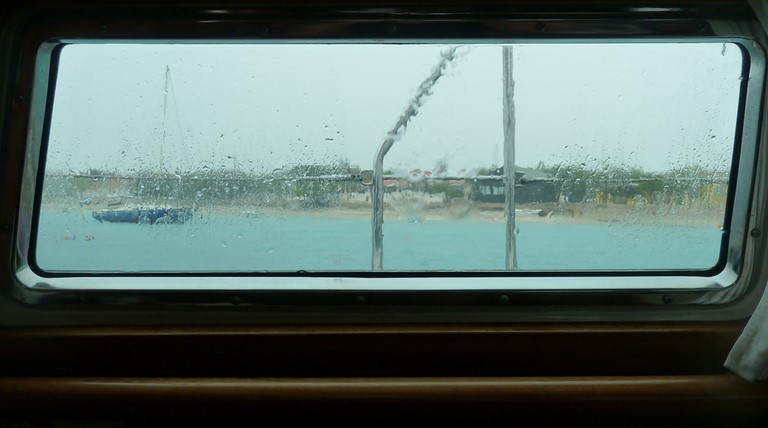 Il pleut et en plus le vent a tourné au sud . Ce qui n'est pas bon du tout pour le mouillage . D'ailleurs il y a un vent de panique chez les pécheurs et les petits bateaux qui s'en vont au port se mettre à l'abri . Ils sont certes très près du bord , beaucoup plus que nous .