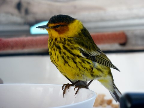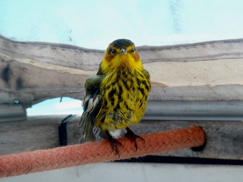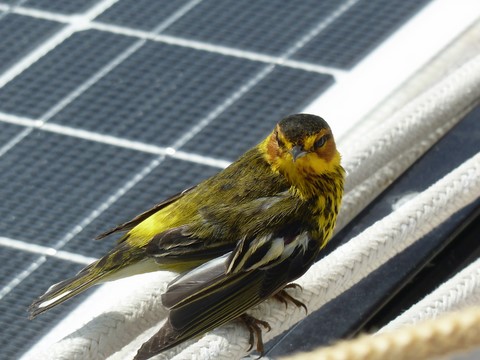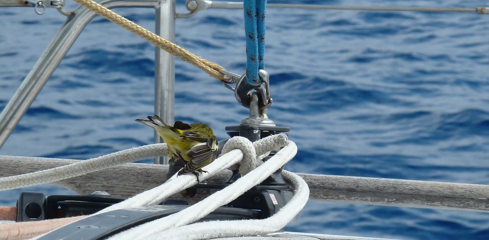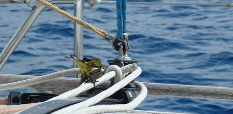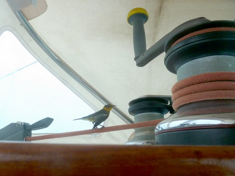 Au début il s'est promené comme sur ces photos . Mais après comme il y avait du vent je l'ai mis sous la capote . Et il est allé se réfugier à l'endroit ou passent la drisse ( corde ) de grand-voile ! Donc impossible de hisser la GV à cause du petit oiseau . Le capitaine n'a même rien dit !