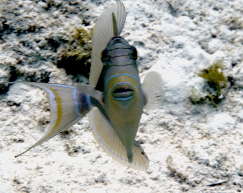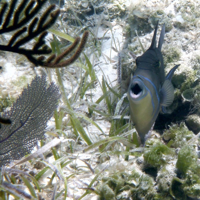 Et toujours pas de requin . J'ai lu qu'il y avait beaucoup de requins aux Bahamas . Donc quand je nage je surveille derrière moi en me retournant régulièrement Et je n'ai vu que des barracudas , grands et dodus et des balistes curieuses et étonnantes car elles ouvrent très grand leur bouche quand elles me voient .