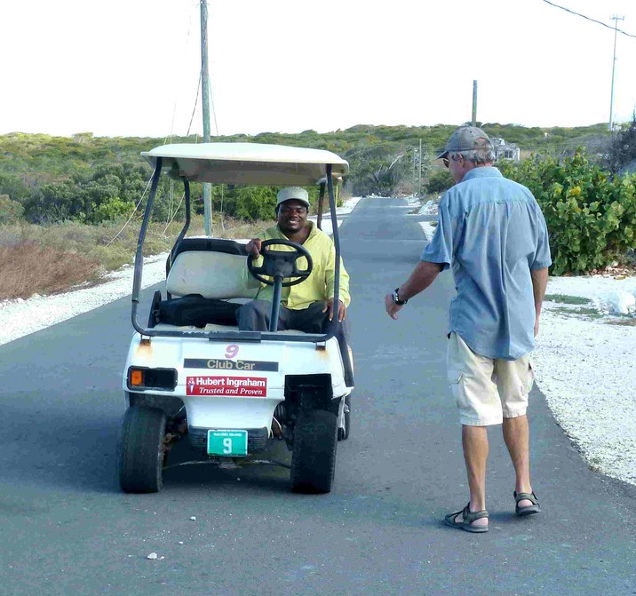 L'unique policier voulait faire ouvrir l'unique magasin pour nous un dimanche car nous venions de loin . Nous y sommes passés le lundi , l'épicerie était toujours fermer ! Ce policier nous a proposé de nous connecter sur son ordinateur et nous a emmenés chez un copain pour que celui-ci nous indique la meilleur route pour aller faire les papiers d'entrée ( la clearance-in ) à Georgetown sur l'île de Great Exuma , et un couple nous a emmenés dans leur petite voiture .