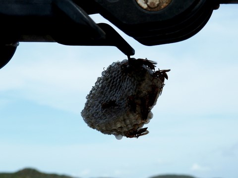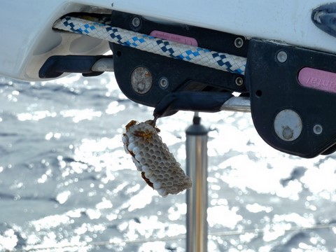 j'en frémis d'horreur car en enlevant la protection de la grande voile avant de la hisser , j'ai du mettre la main , et même les deux mains tout près ! j'ai marché une fois dans ma vie dans un nid de guêpe . J'en ai des souvenirs cuisants .Rien que le souvenir me fait frissonner !