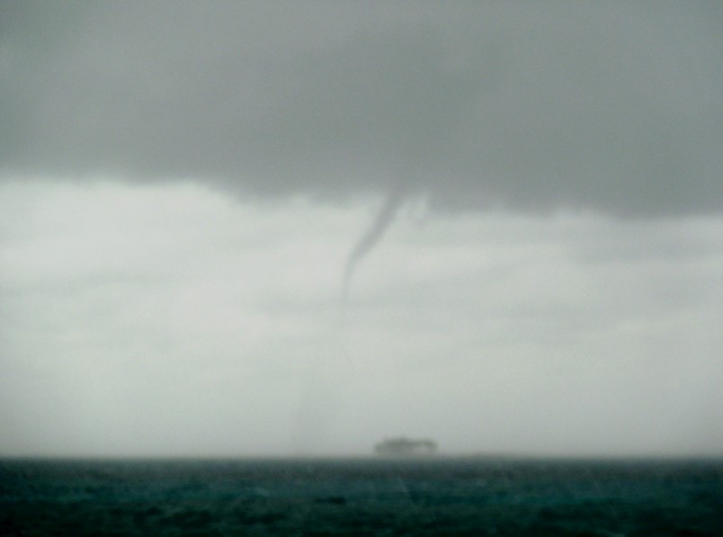 C'est très impressionnant de voir passer une tornade pas très loin de nous . On imagine les dégâts énormes que cela peut causer sur un bateau : les voiles , la sellerie , le décrochage du mouillage ect ... . Il parait que les vents peuvent dépasser les 400 Kms/ H ! aie aie aie !!!!