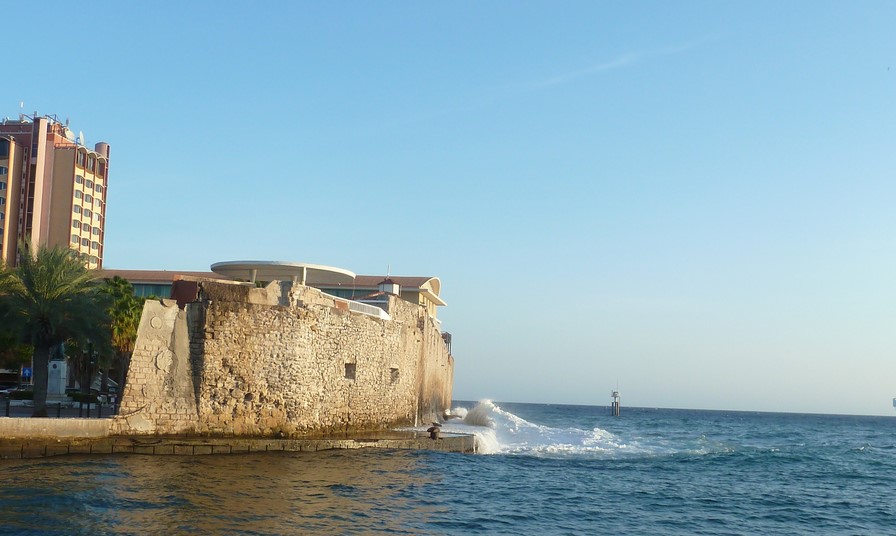 Et derrière les arbres il y a le front de mer avec les touristes des paquebots qui débarquent .