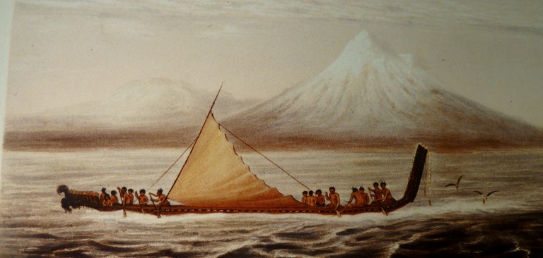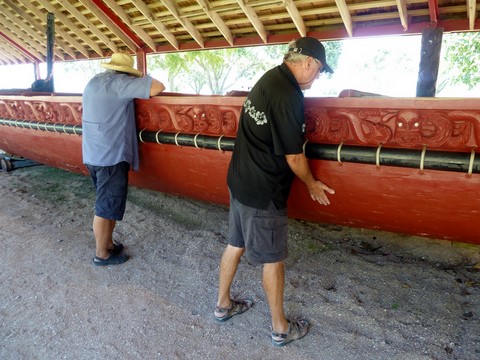 Puis les trois marins s'intéressent de près à une énorme pirogue de 35 mètres , faite avec 3 troncs de Kauri .