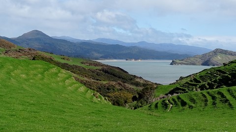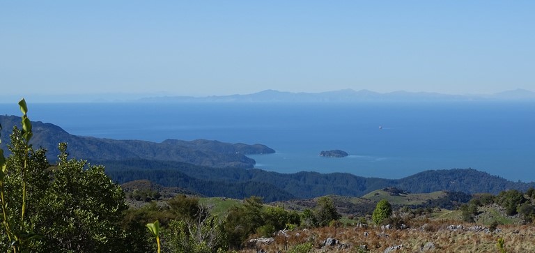 Vers l'Abel Tasman Park et on voit Adèle Island ou nous nous sommes promenés , et au fond les Malboroughs sounds .