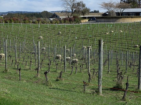 Par contre les moutons tranquilles qui broutent l'herbe au milieu des ceps , ce n'est pas très courant en France . En effet là ou pousse la vigne , dans les régions chaudes et assez arides , il n'y a pas de l'herbe bien verte comme ici . C'est peut être pour cela que le vin Neo Zed n'est pas pareil que le vin français ! D'ailleurs comme on trouve du vin français assez facilement nous buvons