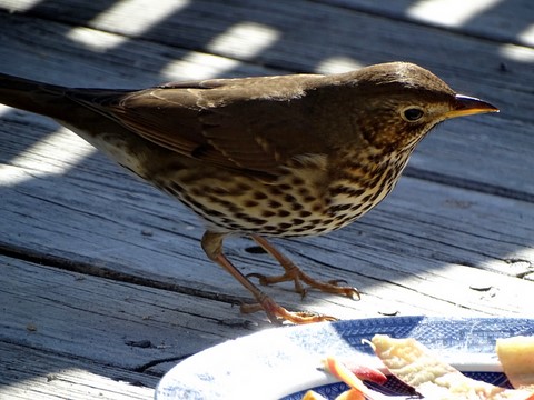 Une grive musicienne vient manger mes épluchures de pommes .