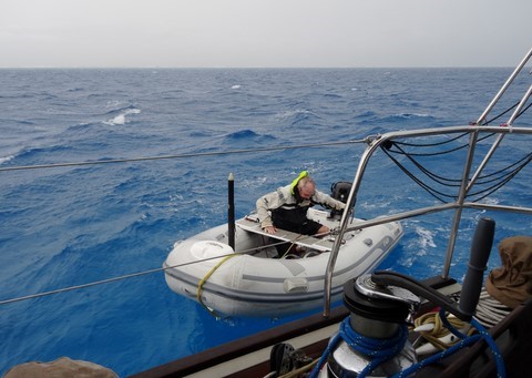Nous metton l'annexe et le moteur dans les vagues sous la pluie .
