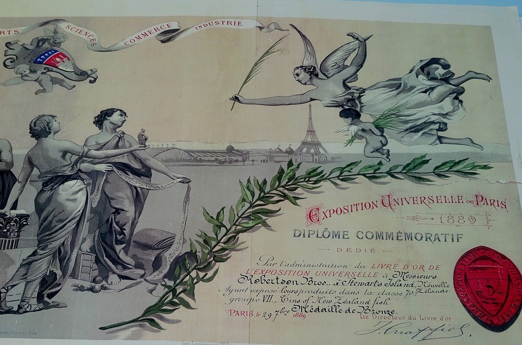 Certificat reçu à l'exposition universelle de Paris en 1889 par les frères Robertson pour leur Blue cod en boite .