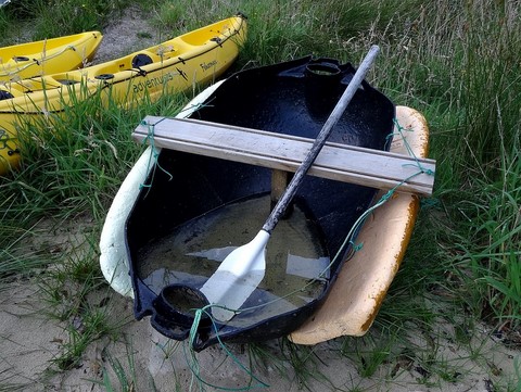 Petite plage avec 1 petite embarcation faite avec une demie bouée de ferme d'élevage de moules ... insubmersible en plus .