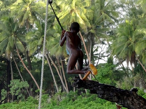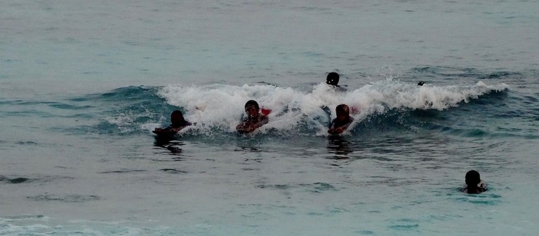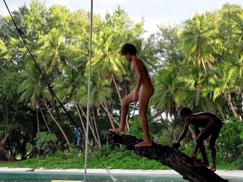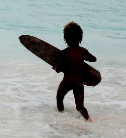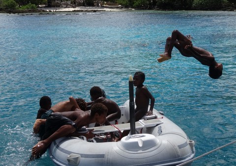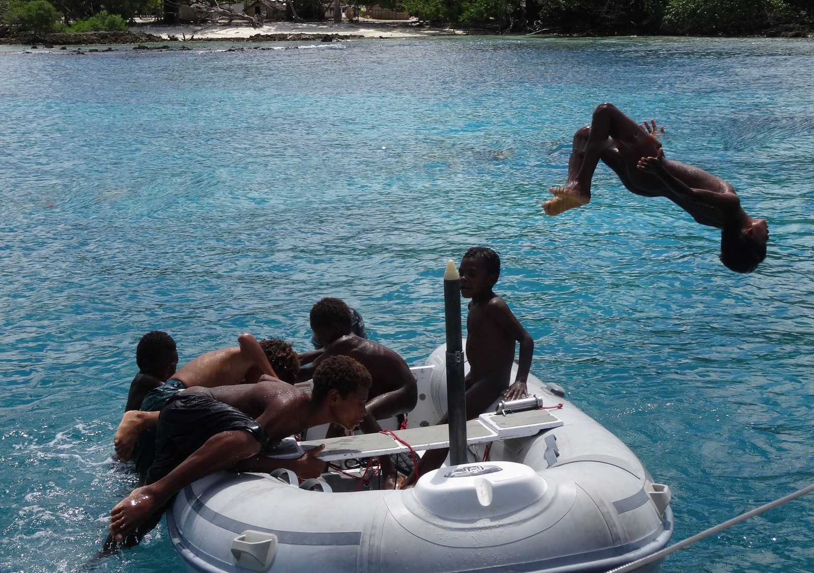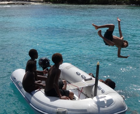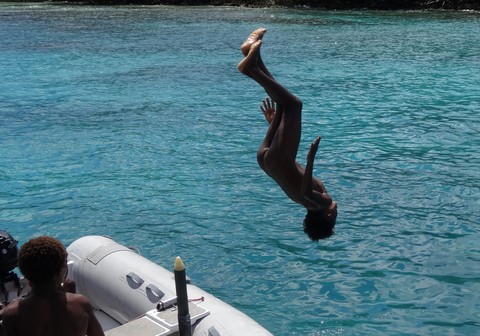 Les gamins reviennent nous voir à la nage et nous font une belle démonstration de plongeons .