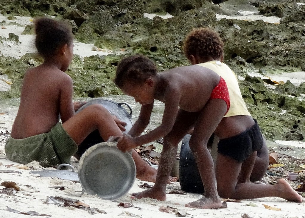 Un groupe de petites filles nettoyent les casseroles sur la plage .